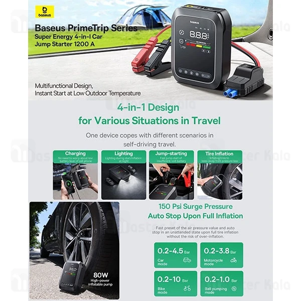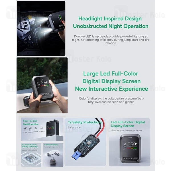 - 4 در 1: جامپ استارتر، کمپرسور، پاوربانک، چراغ قوه